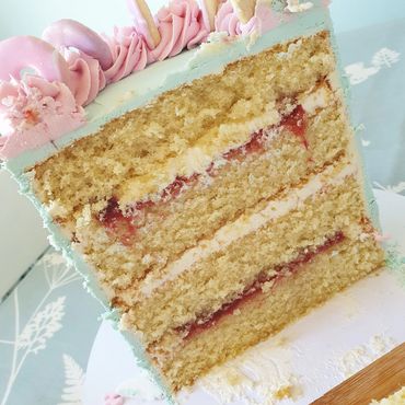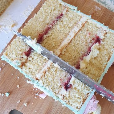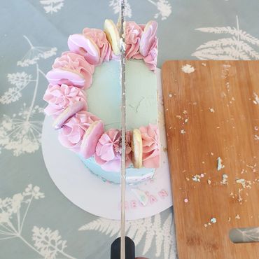 Firstly, remove any inedible decorations and cut the whole way across the cake.